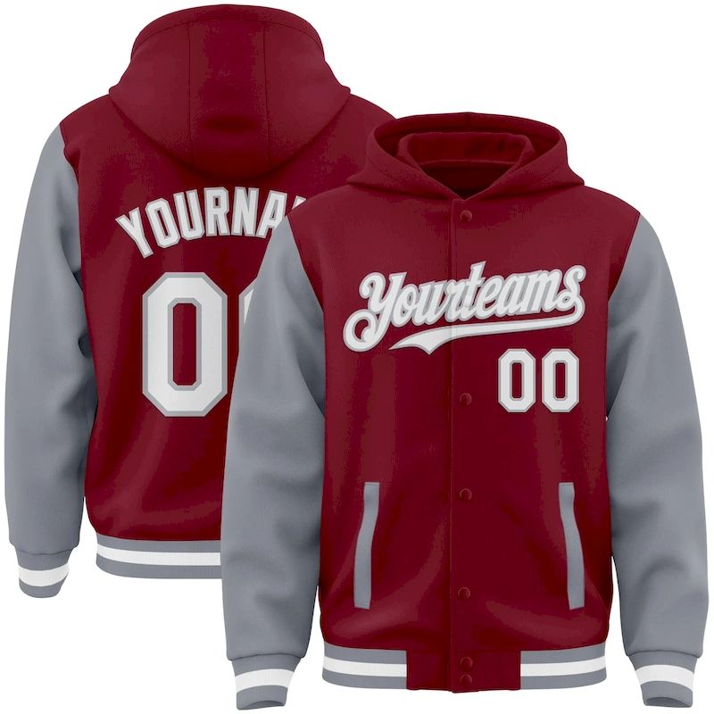 Custom Crimson White-Gray Bomber Full-Snap Varsity Letterman Two Tone Hoodie Jacket