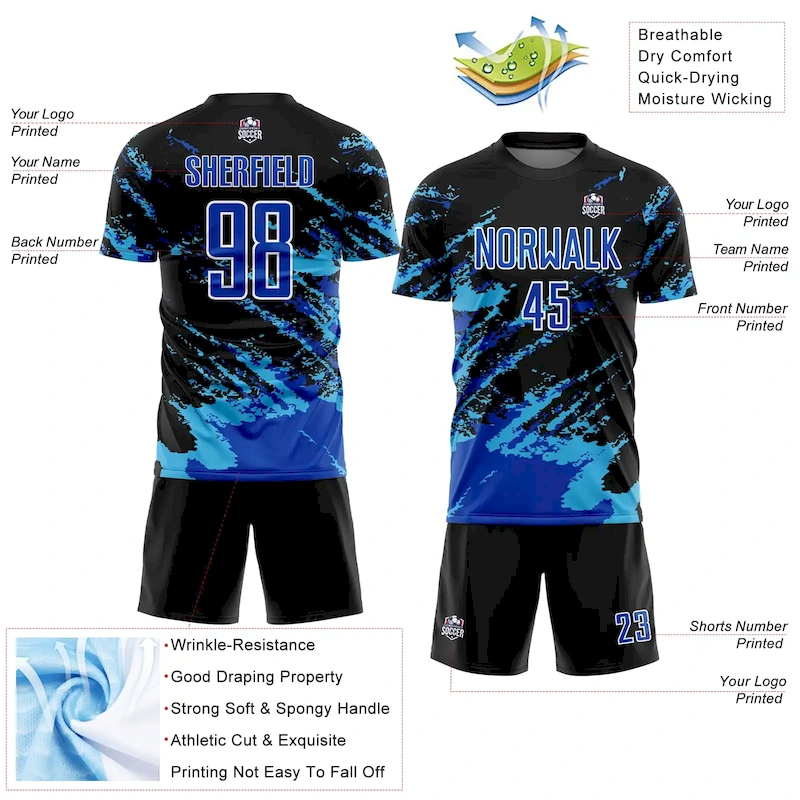 Custom Black Thunder Blue-Sky Blue Abstract Fragment Art Splash Sublimation Soccer Uniform Jersey