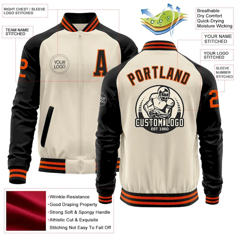 Custom Cream Orange-Black Bomber Varsity Letterman Two Tone Zipper Jacket