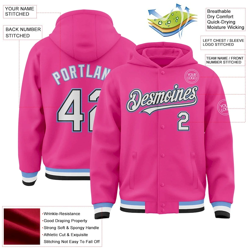 Custom Pink Black-Light Blue Bomber Full-Snap Varsity Letterman Hoodie Jacket