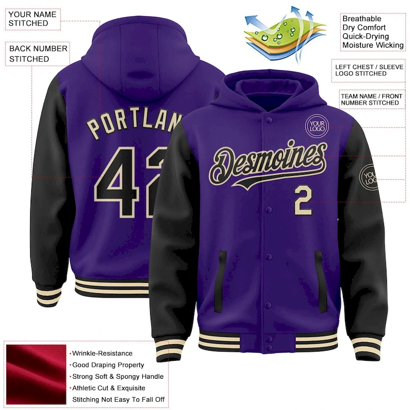 Custom Purple Black-Cream Bomber Full-Snap Varsity Letterman Two Tone Hoodie Jacket